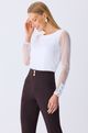 Confeccionada em Mesh Na Cor Branca, a Blusa Se Destaca Pela Textura Diferenciada e Transparência Sutil Nas Mangas, Adicionando Um Toque de Glamour e Atitude. É Ideal para a Mulher Que Busca Versatilidade, Transitando com Elegância Entre Diversas Ocasiões. Coordene com a Calça Tóquio Brown para Um Visual Completo e Sofisticado.
