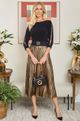 Saia Plissada Old Gold, com Um Comprimento Midi, É a Escolha Perfeita para Quem Busca Um Equilíbrio Entre Elegância e Modernidade, Sua Modelagem Evasê Que Desenha As Curvas de Maneira Suave, o Cinto Drapeado, Adornado com Uma Fivela Deslumbrante Na Cor Ouro Define a Cintura de Forma Encantadora. Seu Efeito Metalizado em Toda a Extensão da Saia Não Só Adiciona Um Brilho Sutil, Mas Também Reflete Luz de Maneira Deslumbrante, Garantindo Que Você Se Destaque em Qualquer Ocasião. Podendo Ser Combinada com a Nossa Blusa Crepe Black Manga Especial.