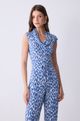 O Top Claudia É Confeccionado em Tecido Fluíty, com Toque Macio e Caimento Leve. Possui Modelagem sem Manga e Gola Degagê, Destacando-Se Pela Estampa em Tonalidades de Azul. Coordena Perfeitamente com a Calça Claudia, Criando Combinações Modernas e Estilosas.