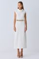 Confeccionado No Nobre Tecido Paris Na Cor Off-White, o Vestido Se Destaca Pela Gola Drapeada. Acompanha Um Deslumbrante Cinto em Corrente Na Cor Ouro, Que Adiciona Um Luxo Discreto e Valoriza a Silhueta. É a Escolha Perfeita para a Mulher Que Busca Versatilidade em Eventos Especiais, Transmitindo Confiança e Distinção.